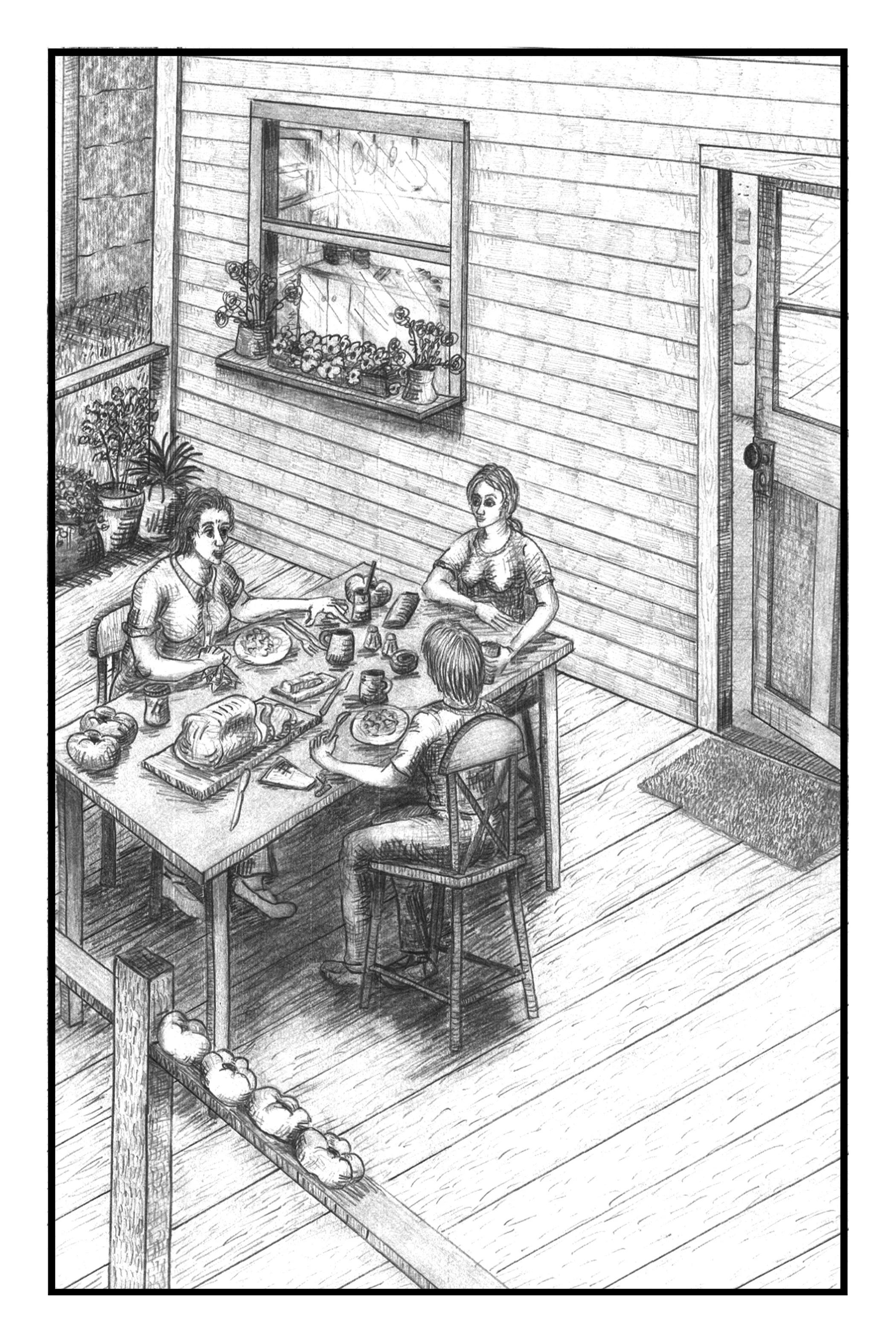 They heard footsteps crossing the gravel driveway from the house next door. In a moment a large older woman in a long navy blue skirt and a pale blue shirt walked up to the porch.