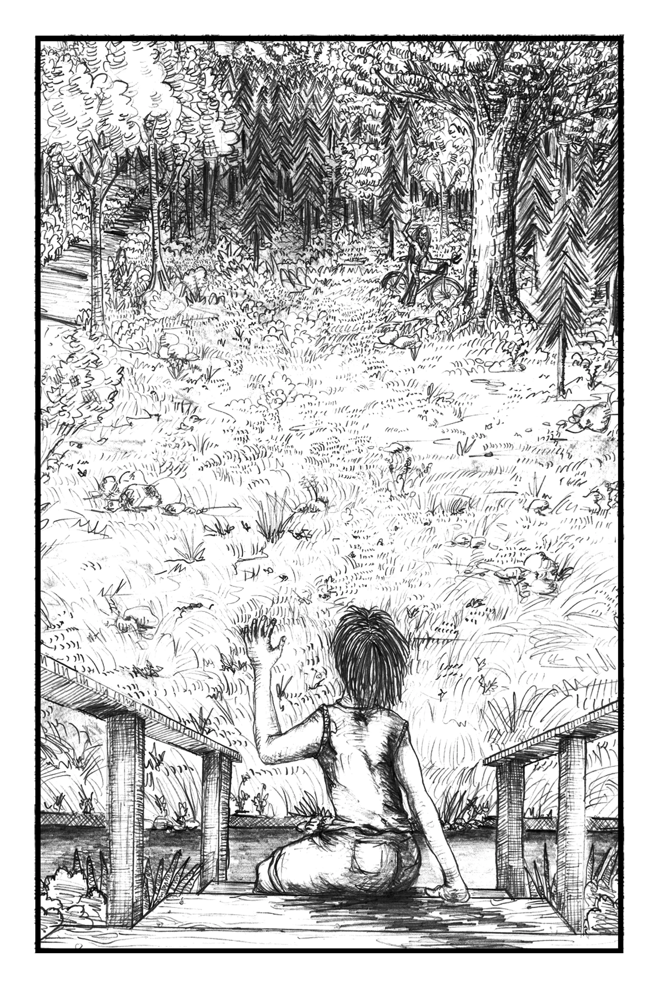 As she sat there on the steps, looking aimlessly into the distance, she noticed the thin dark form of Abby coming back up Main Street, turning her bike left on Oak Knoll Lane, and continuing on up toward Glenda’s house. But near the end of the lane, Abby rode over the field toward the forest. She looked back toward Phoebe and waved, and then disappeared among the trees.