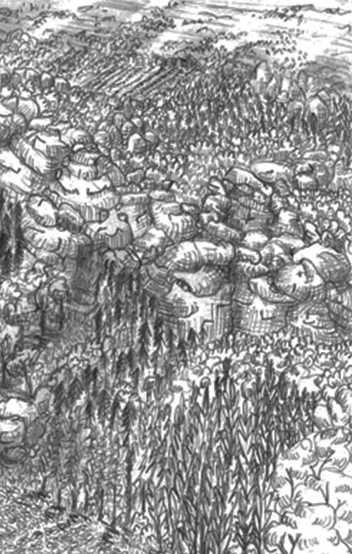 Phoebe took a last look at the cliffs and forest in the distance. It was a world she had never seen before, and looked so intriguing and inviting, yet scary too. Reluctantly, she turned and followed Abby, crawling back through the wall of thorns and vines. A cloud of gnats buzzed around her, getting in her ears and eyes. Mosquitoes were settling on her bare arms. The light became dim and murky, and gave the forest a different look than before. Small animals moved around them, making faint noises. Living things seemed to lurk in every shadow. The ominous croaking of a bird came from just over her head, and something howled in the distance.
