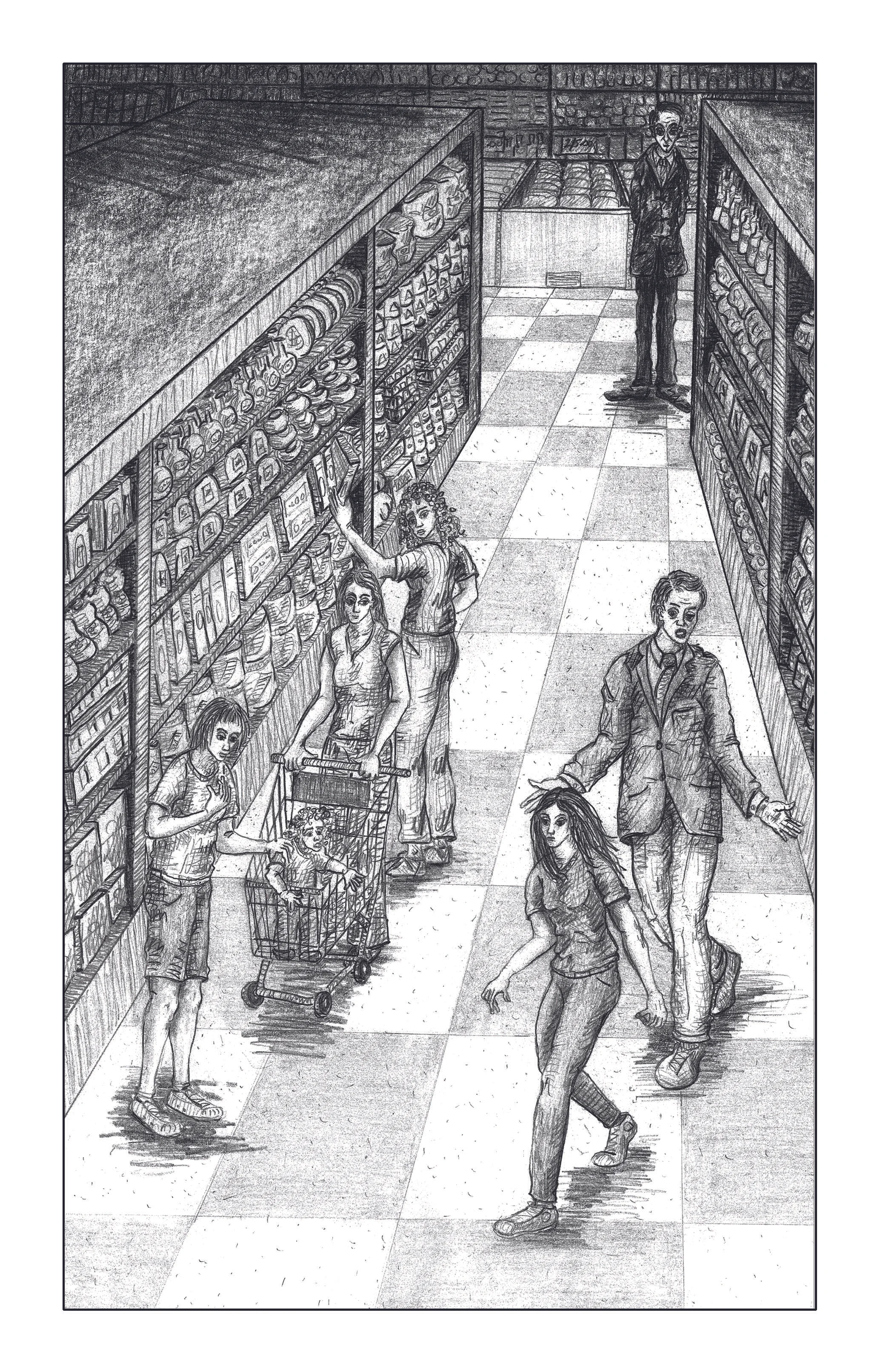 But Abby continued walking out of the store without a backward glance. Scutter was left standing at the sliding door, uncertain of what to do next. He looked well-dressed but out of place in penny loafers, pressed slacks, a well-ironed pale yellow shirt, and a dark blue blazer with a college emblem on the side. Despite the intense air conditioning, he wiped the sweat from his brow with a white handkerchief, and pushed his hair back into place. He looked around with embarrassment. A security guard hurried to the scene but Scutter waved him away. Seeing Penny approaching with a full shopping cart, he tried to smile and said, “Good to see you, Penny. Rumor has it you’re having a party. Glad to see you’re buying here.”